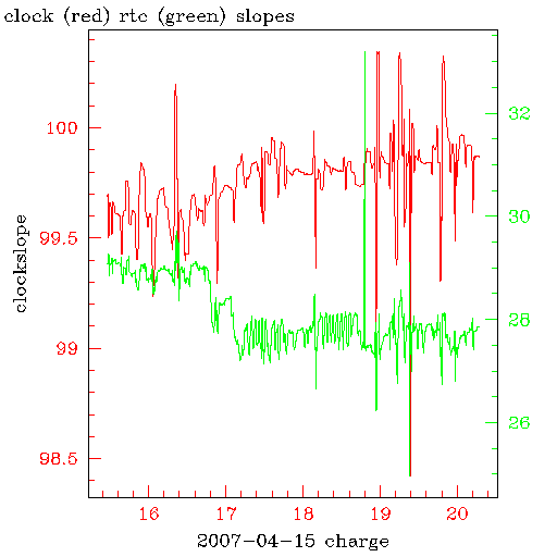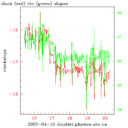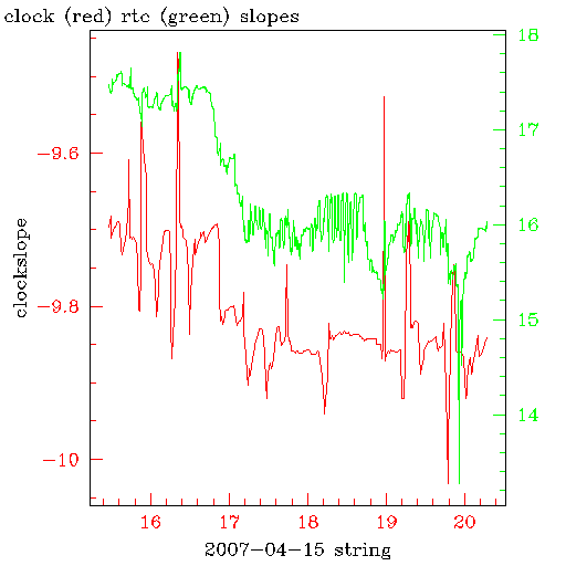 The following graphs plot the rate of the system clock vs the ntp server (red line and left hand scale) and the rate of the RTC vs the system clock(real time clock-- the CMOS clock)( dotted lines and right hand scale) against the time in days after 00:00 on the date shown. The rates are in units of microseconds per second. These rates are determined by comparing the reading on the system clock with the ntp determined times on the NTP server to adjust the rate of the system clock, and the rate of the RTC vs the system clock. Note that the strong correlation between the rate fluctuations suggests that the system clock is the primary source of noise, and that in general the RTC has better stability than does the system clock.