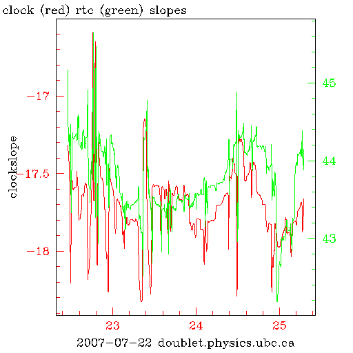 The following graphs show the fluctuations in the rates of the system clock and of the real time clocks on a variety of computers on the theory network. All synchronize against the same system, ntp.ubc.ca, a stratum 2 ntp server on campus ( the time delay is on the order of 100s of microseconds to that machine from any of these computers).