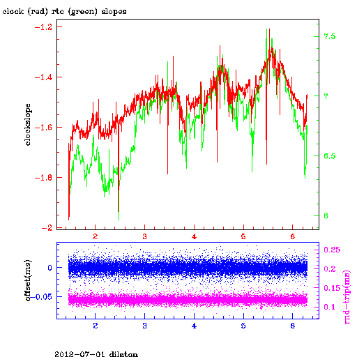 These two graphs represent the very different response of chrony and ntp to glitches in the drift rate of the clocks. I have no idea why the clocks suddenly have drift rate changes, changes which seem to effect both the system clock and the rtc but at very different magnitudes. In the case of chrony a 2PPM change in the rate, causes a 100-200usec change in the offset, but that disappears withing about 5 min and the clock settles down to its new rate. In the case of ntp, a 0.4 PPM change in the rate causes a 600usec change in the offset, and this offset takes a about 6 hours to disappear to settle back down to the pre glitch level. Now of course the detailed structure of the rate change is unknown since all we have is the offset and rate as reported by ntp. Thus, a glitch which is 1/5 as big produces about 5 times as big a change in the offset, and the time for this change to disappear is about 20 times as long.