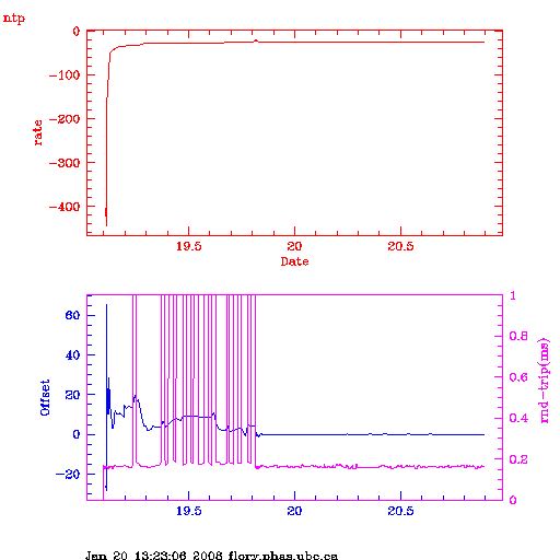 To investigate whether the oscillations with about a 1.5 hour period in most of the chrony graphs are real fluctuations (eg caused by temperature fluctuations with a 1.5 hr scale) or are produced by the clock algorithm of chrony itself, I placed flory onto ntp as the client instead on Jan 19 2007. What is striking is how long it took the ntp client to come into sync. In the graph below a plot of the offsets, the rate set by ntp on startup. NOte that there was no drift file, so ntp had to figure out what the drift rate of the clock was on its own. But the behaviour was such that the clock, which was within less than a ms of the correct ntp time before the change to ntp and running at the correct rate (having been set by chrony), ntp caused the clock to rapidly go to a -20ms offset overcorrect to a 60ms offset and then take hours to finally get the clock back to about +5ms. Overnight, it went to a poll number of 10 (2^10 sec) and the switch between flory and string seems to have occasionally introduced 5-10ms delays ( about 20% of the time). However, ntp over the next 8 hours never managed to get the offset below 3-6ms. At daynumber 19.815 I restarted ntp with maxpoll 7 ( which was the same as I had run chrony at) and the offset now rapidly settled down to about 100usec., and began to have both positive and negative excusions. Ie, ntp seems to have a really hard time dealing with transient effects (like being started without a drift file). Chrony on the other had even with a one second initial offset settles down to a locked, minimal offset conditions in less than an hour.
