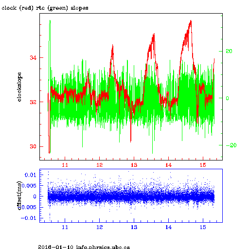 The following graphs show the fluctuations in the rates of the system clock and of the real time clocks on a variety of computers on the theory network. Until June all were synchronize against the same system, ntp.ubc.ca, a stratum 2 ntp server on campus ( the time delay is on the order of 100s of microseconds to that machine from any of these computers). as the top graph shows that server had a 3-4 msec sawtooth drift against GPS time. Thereafter, string was synchronized against tick.usask.ca, a stratum 1 server synchronized against GPS. In Sept, 2007, string was put onto ntp and sychronized against a stratum 0 GPS clock ( A Garmin 18LV GPS receiver with a PPS output) against which it maintains a roughly 2-3 microsecond offset. All of the other clocks are chrony synchronized against it. It is less a msec via switches away from all of the other clocks.